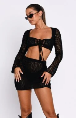 I Was Here Long Sleeve Crochet Crop Black