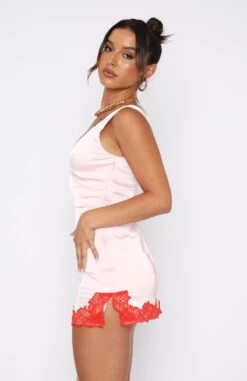 The Magic Love Mini Dress in Blush is fun and flirty! Featuring thick straps, plunge neckline, lace hem detail, cut-out side detail, invisible side zipper, tie-up waist detail, and lined, silk-feel fabric. Pair with gold accessories and clear mules for a show-stopping look!
