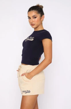 Life is better in loungewear. The Moving Different Baby Tee in Navy features short sleeves, printed logo centre front, fitted and soft stretch fabric. Just add the Moving Different Sweatpants and Lounge Shorts.