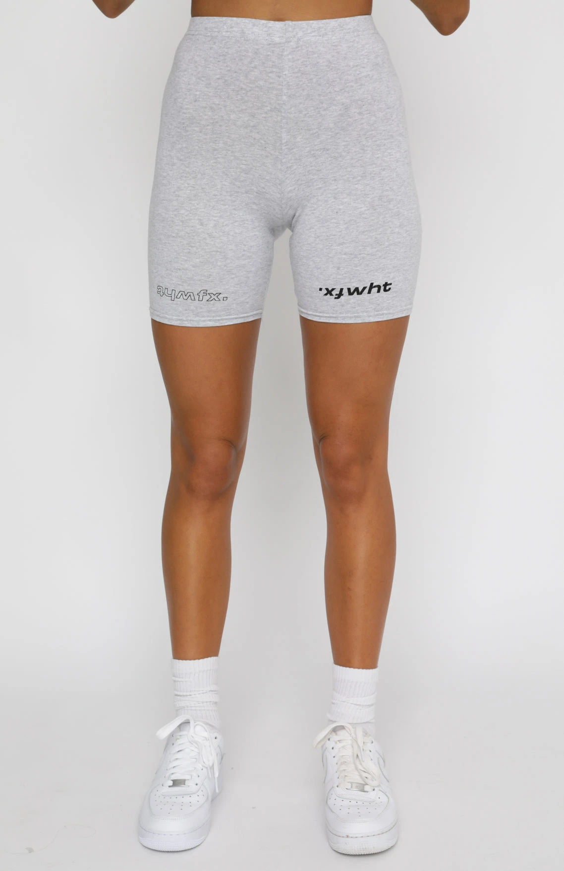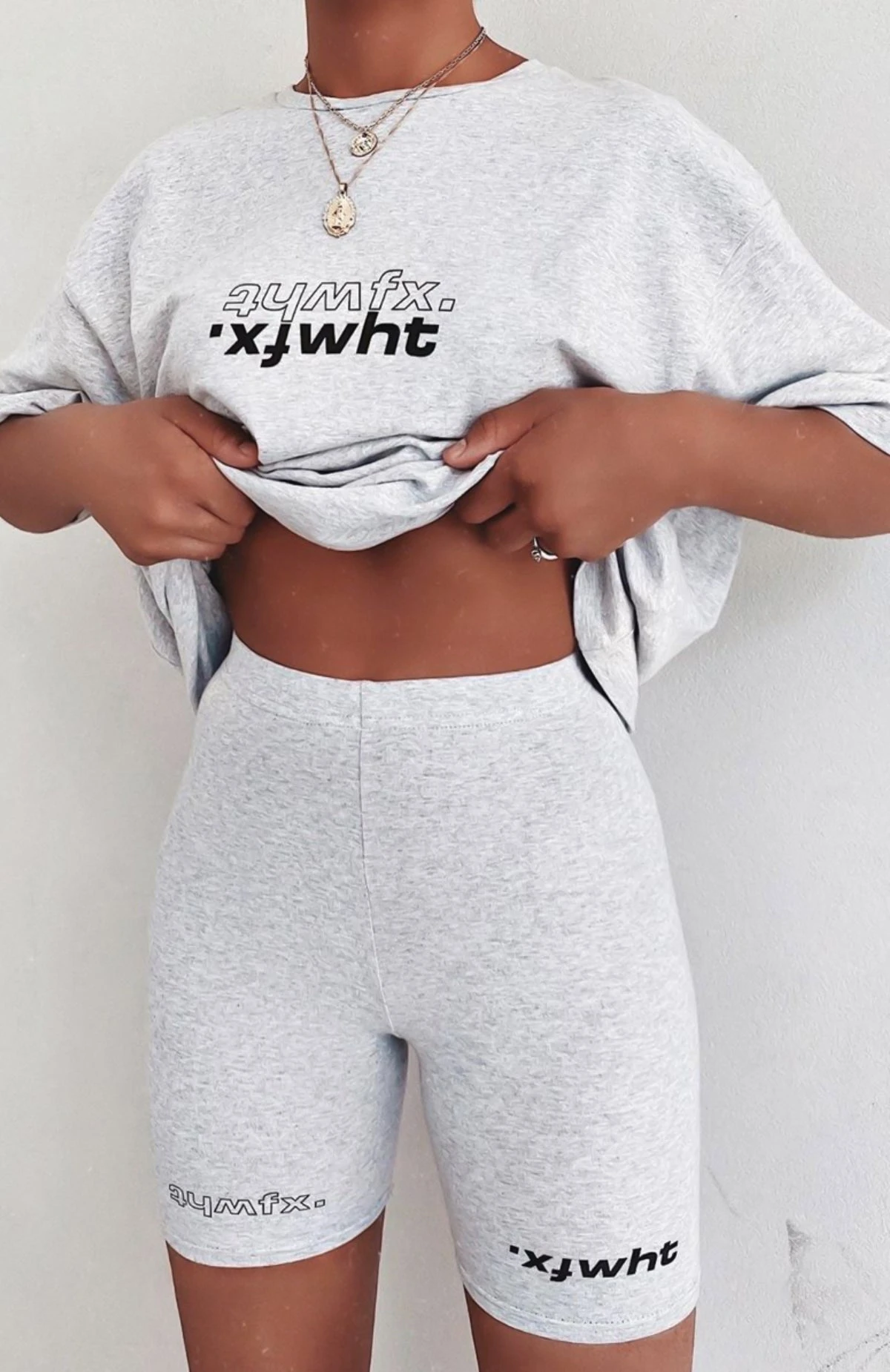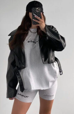 We’re obsessed with the Real Games Bike Shorts in Grey Marle for a chilled out vibe. These cycle shorts are high waisted with an elastic waistband, stretch fabric and printed logos above hem. Wear as a matching set with the Catching Feelings Tee and white sneakers for an effortless look.