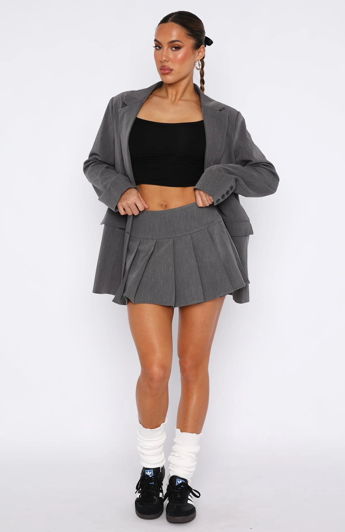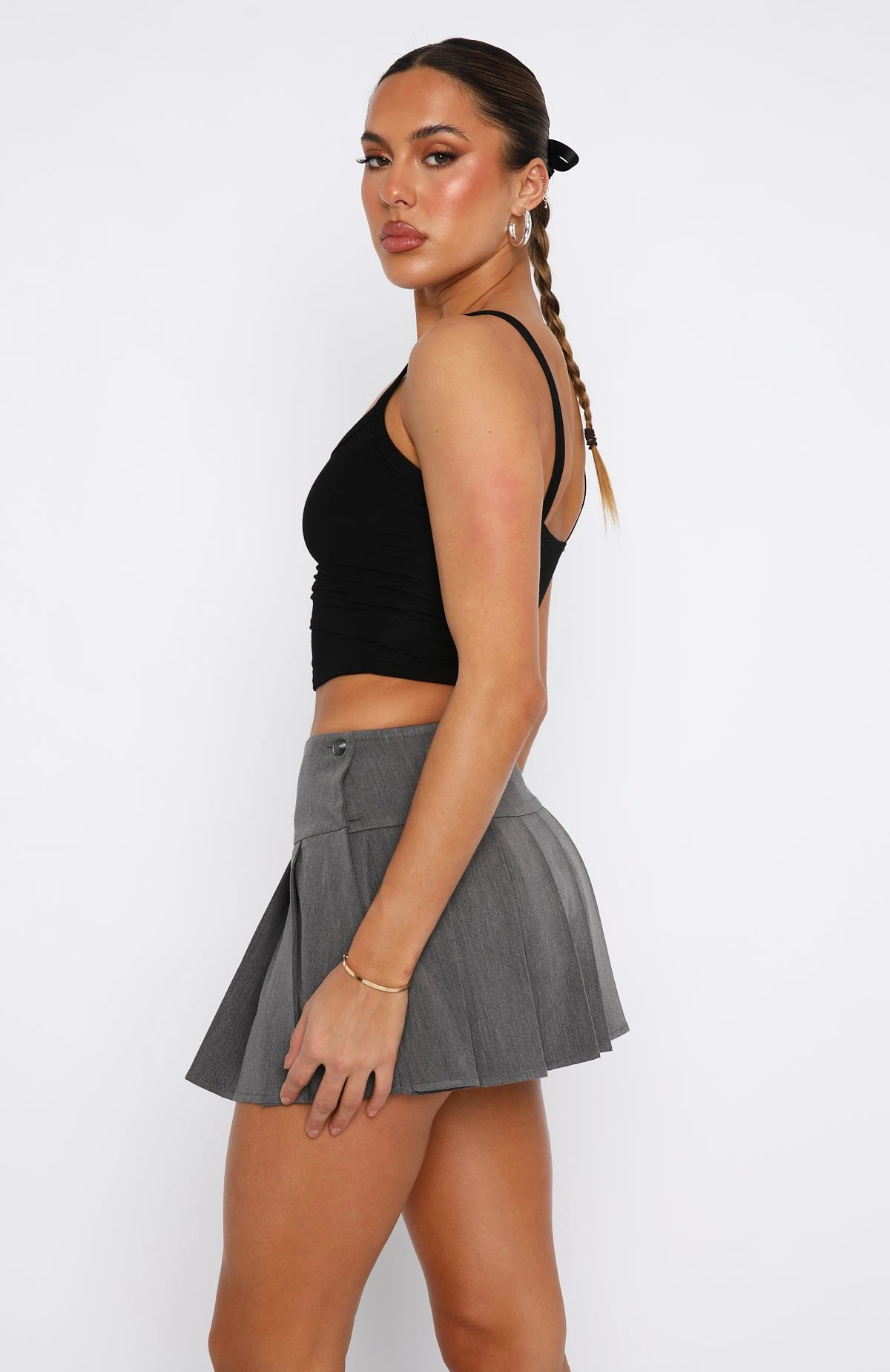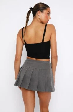 Serve business chic with the Romance With You Mini Skirt in Charcoal. This mini skirt features a pleated hem design, thick waistband, unlined fabric with side button closure. This skirt is a low waisted fit but can be worn high waisted if sized down. Best paired with The Way To Go Oversized Blazer and a white tee for a fit’ worthy of your day to night plans.