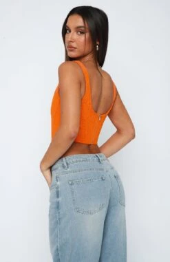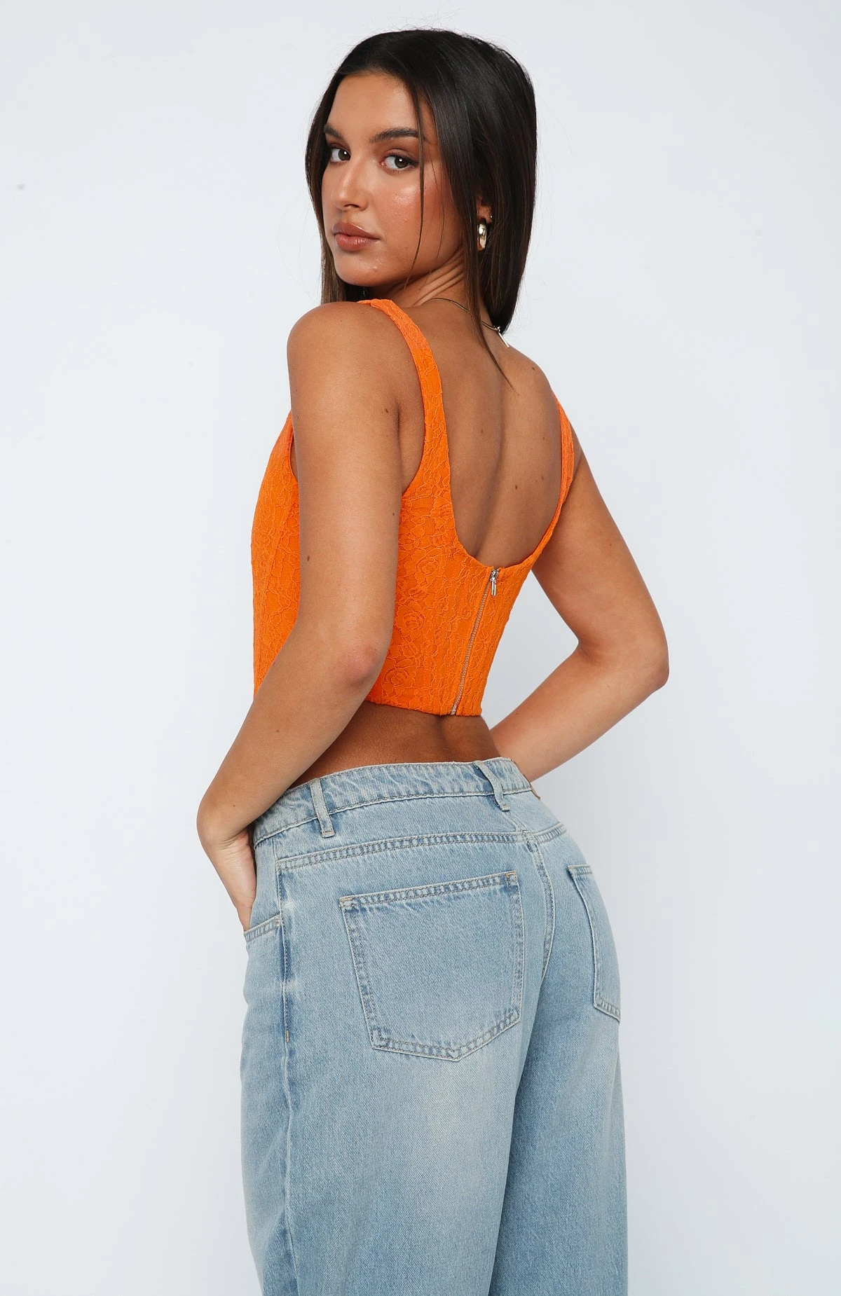 Brighten up your weekend wardrobe! Add a pop of Orange to your new season wardrobe with this Wait Too Long Bustier Orange. Featuring thick straps, boning in bodice, curved edge, zipper centre back, gorgeous lace and lined fabric. Complete the look with the matching your favourite White Fox jeans and perspex heels for a stunning look!