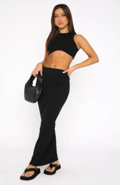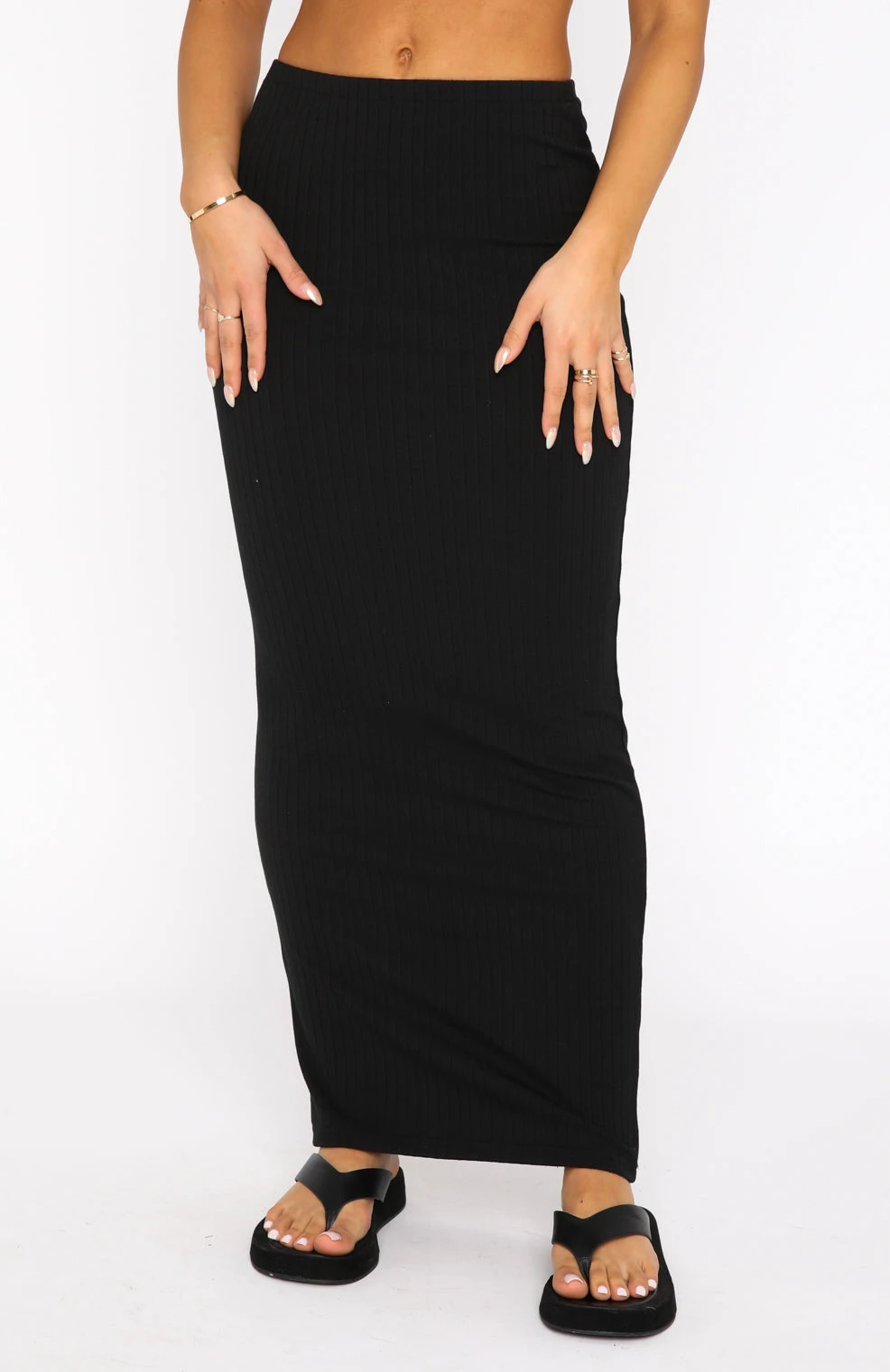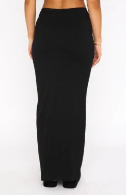 Feel stunning in our Walk Behind Me Ribbed Maxi Skirt in Black. This maxi skirt can be worn as high waisted or low rise with a thin elasticated waistband, maxi length and ribbed, stretch fabric. Complete with a cute crop top and sandals for a hot casual but chic look.